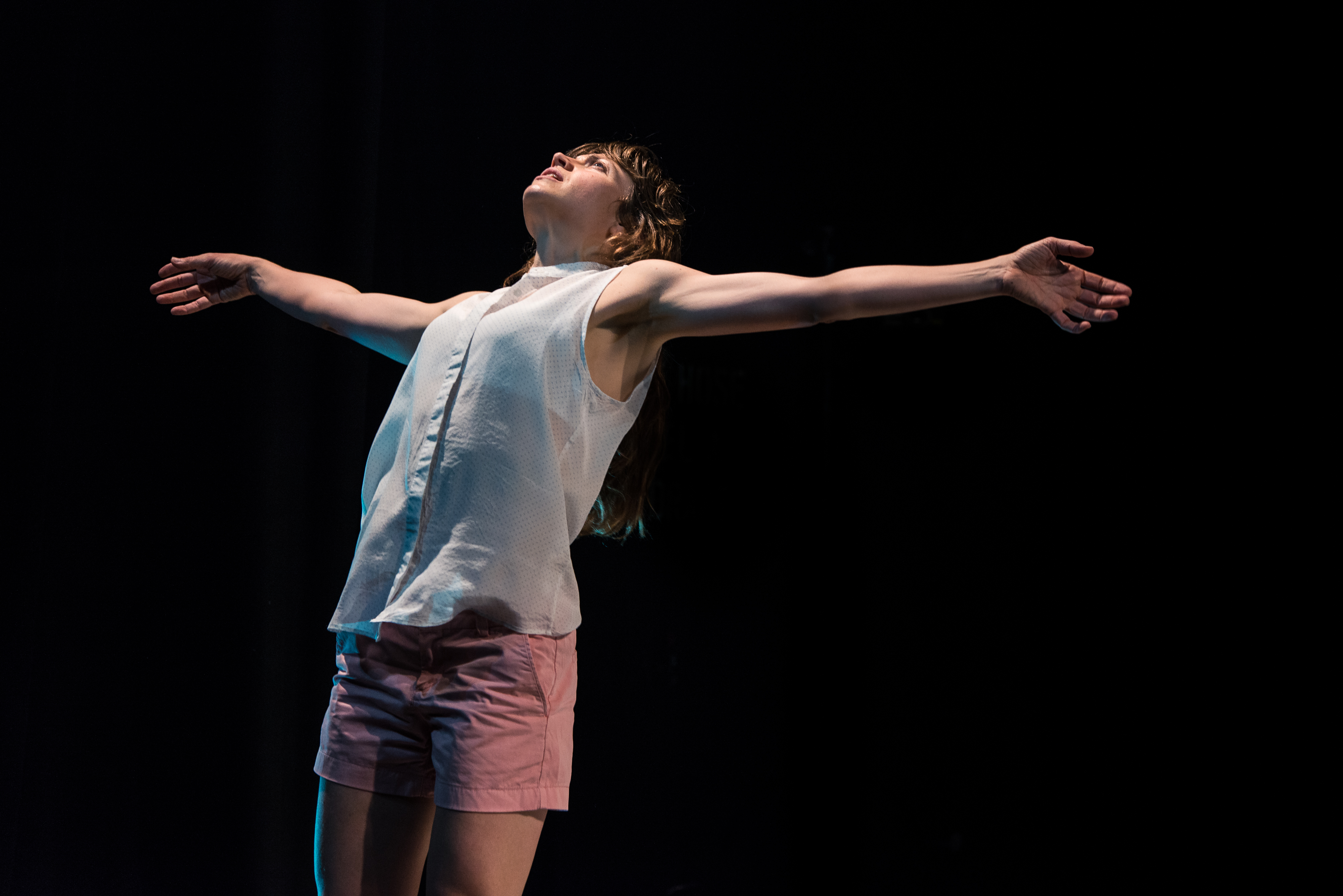 It is in fact this weird juxtaposition of her physical domination in the performance space and the intellectual content of her monologue set to a lo-fi synth soundtrack by Kelly Ryall that makes it all so compelling. I suspect that if this were simply text without movement, it would be a very dry stand-up routine, and if this were simply movement without text, it would be too random to decipher. The movement, music and text don’t always meet in the middle, but when they do, it’s often hilarious and sometimes as subtle as a ripple across the water.