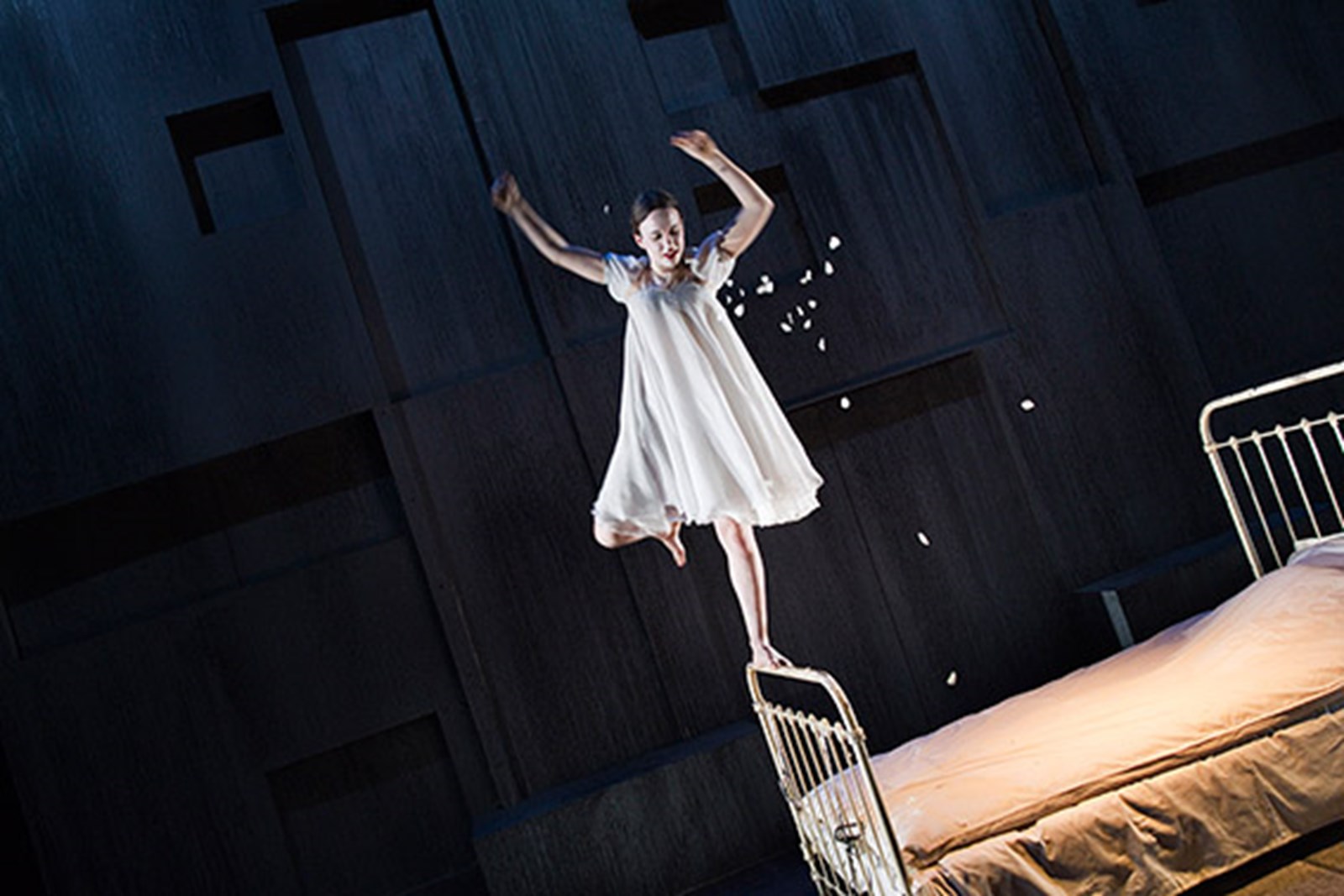 Tulinius’s set and Adalsteinn Stefansson‘s lighting design are striking. The set is a wall full of multi-level rectangular recesses that act as doors and windows. Because it is suspended, it can be lowered and tilted, imposing itself on the scene to great effect when necessary. Stefansson’s lighting is intricate, putting specials on each rectangle, using side lights to highlight the actors’ forms, and manipulating projections in creative ways.