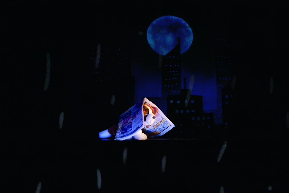 Projected animation sets the location of each part of the story, and Gray and Watts have really mastered how to make a puppet ‘move’ through scenery, though it’s actually the animation that’s moving. They’ve incorporated sequences that resemble video games, a la Donkey Kong or Super Mario Brothers. This delights all ages, as we watch the dog slide down underground tunnels, jump over tall buildings, or float through murky reservoirs, for instance.