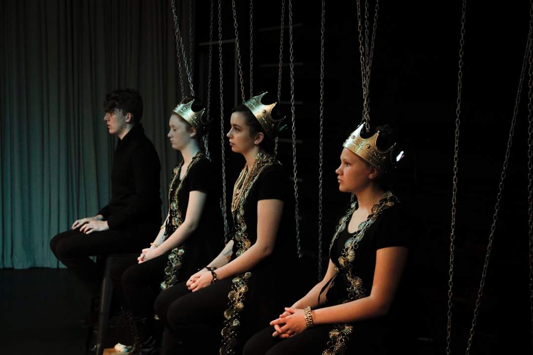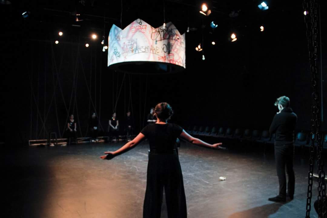 A cast of 10 young performers faces off at either end of MPAC’s black box theatre, the Fishtrap. They’re seated in rows in front of suspended chains, while suspended over center stage is a giant crown covered in graffiti, designed by Sally Phipps. The performers are clad in black with gold accents, and the atmosphere is tense, stark, no-nonsense. A blackout signals the beginning, and after lights up, we are introduced to the show’s trusty narrator, Cordelia (Courtney Brown). She breaks everything down for us, but she also takes part in the action.