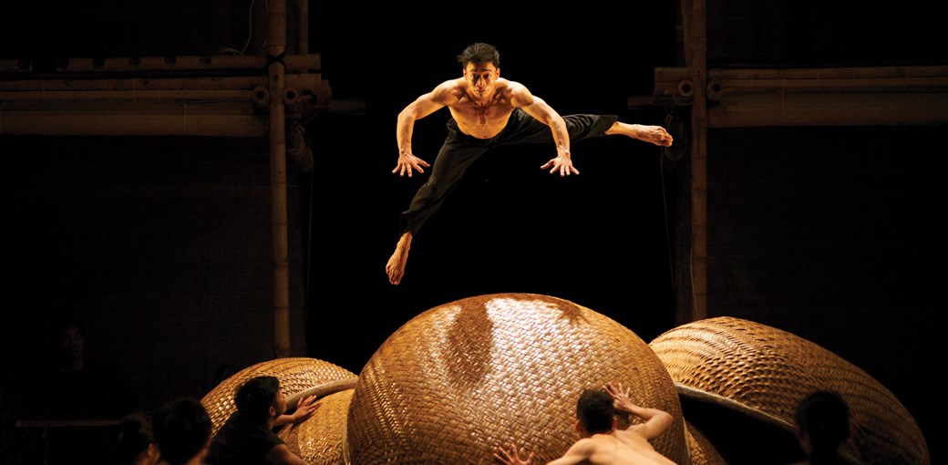 Director Tuan Le creates illusion from the agile acrobatics of the troupe, moody moonlit scenes where forms emerge from semi-darkness, and a range of simple props used with ingenuity. Coracles aren’t just boats, they’re rocks for frog-jumping, rolling portals for performers to surprise us from, giant baskets to swing in. Large bamboo poles are hefted across the stage, then walked across as balance beams. Straw baskets transform the performers from human to crustacean, and then get stacked two feet high onto an acrobat’s head while traversing the stage.
