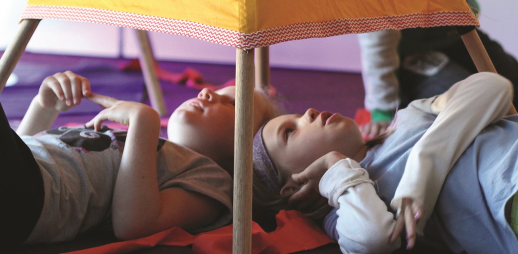 The Small Voices Louder journey begins with the kids lying on their tummies for a bit of an introduction by Desebrock. Maddie and Chloe said there was a bit of mystery and excitement in this moment, because they couldn’t yet see what was behind the curtain in the room. But soon the curtain opened, and they found a roomful of eight tents to explore, each of which posed a simple question and had a microphone to record the kids’ answers.