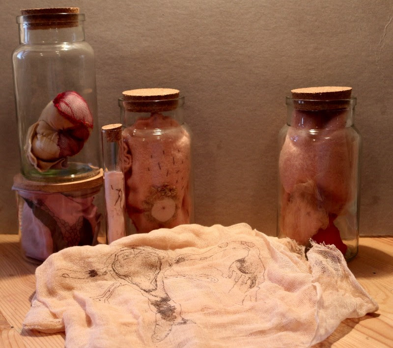 The exhibition becomes a museum of curiosities and specimens, with soft fabrics stored in jars in a slightly detached, scientific but still humorous arrangement. “Separating it and putting it on a shelf in a jar enables us to look at more critically. It takes away some of the emotion in order to look at the parts in a very scientific, factual way,” he says.