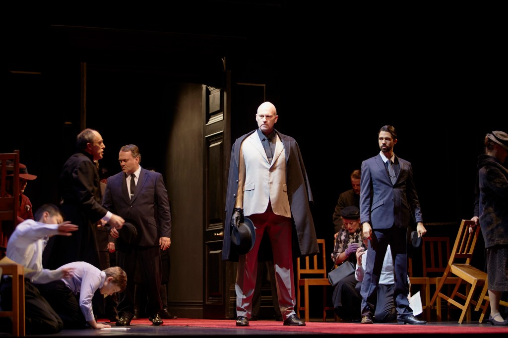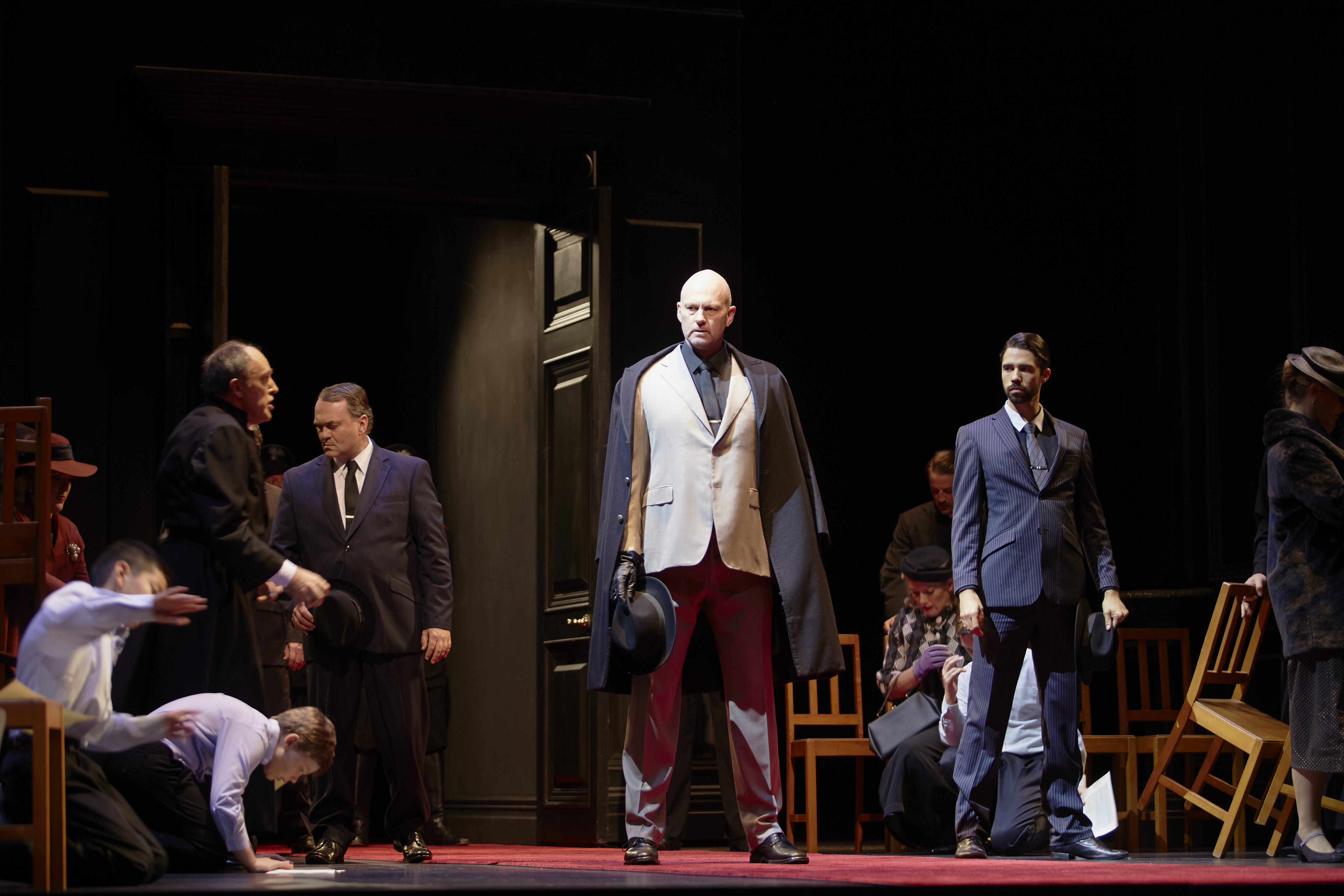 In Act Two, the set is transformed into Scarpia’s office, again all epic floor to ceiling black wood panelling. One wall opens to the room where Cavaradossi is tortured, but all we see when the door opens is light spilling through, so we are made to imagine the horrors within. Again, the lighting is used to great effect. Tosca’s famous aria “Vissi d’Arte” has Halloran standing in a grotesque enormous shadow cast by Scarpia’s shadow on the other side of the room. It was an amazing moment. He has succeeded in breaking her, or so he believes, by promising to release her lover if she submits to his passion. Scarpia’s murder in the next instant is well deserved and bloody. We want to cheer his death.