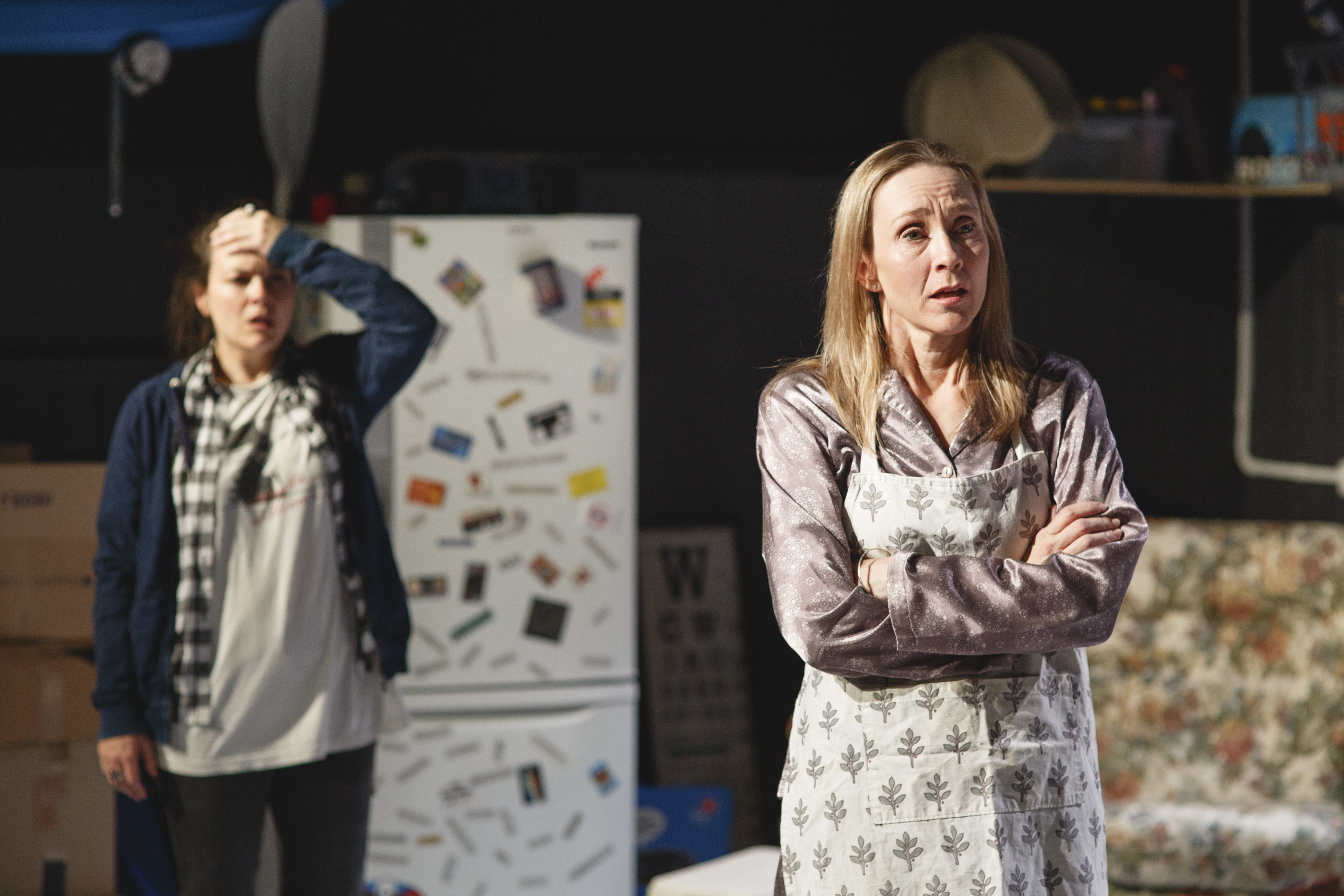 We walk through a superb set from Sally Phipps to our seats. We are inside a garage, filled with the detritus of a long life, with the family Christmas tree, an old esky, chairs, an ancient fridge and other remnants of the stuff we don’t want to throw away (we all have garages like this). We meet the sisters in spotlit monologues at the moment of them learning their mother has died: Candice (Alison van Reeken), the eldest, uptight and antsy; Alex (Amy Mathews) the middle sister just starting Alcoholics Anonymous; and Sydney (Anna Lindstedt), the youngest, quietest sister.