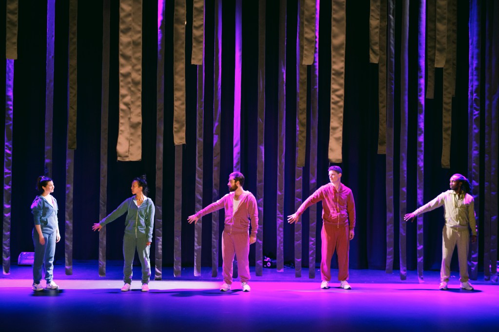 Two women, Arielle Gray and Frieda Lee, and three men, Mararo Wangai, Jeffrey Jay Fowler and Chris Isaacs, never speak to each other; this is a play with no direct dialogue, yet they communicate with gestures and facial expressions, and through their rhythmic advice to the audience. This slick performance shows their skills with both movement and speech. The petite Frieda Lee with a giant, compelling smile paired well with Arielle Gray; together they gave us two strong female characters doling out advice and not taking any sh*t. Chris Isaacs has perfect deadpan delivery and movement, and Jeffrey Jay Fowler is clever and a little snide at times. Mararo Wangai, a powerful, totally present and credible performer, delivered a brilliant monologue on race. These were the moments I was truly engaged, when I could listen a little longer than a snappy soundbite; the breakneck speed is commendable, but I wanted a little more connection and time to absorb what was being said.