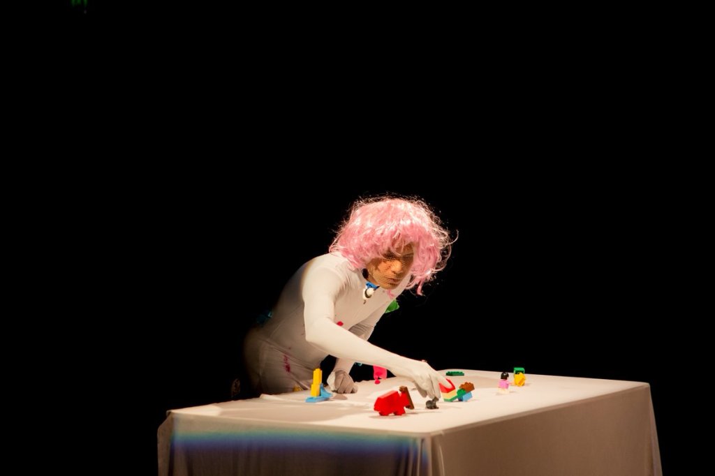 The show opens with Pether standing in a white unitard, crowned by a matted pink party wig, his face obscured by something made with fishnet, with empty balloons, Lego pieces, and animal figurines pinned to his garment. He’s arranging other Lego pieces and animal figurines on a rectangular table covered with a white sheet; he does this with great care and attention, making sure each piece is positioned just so.