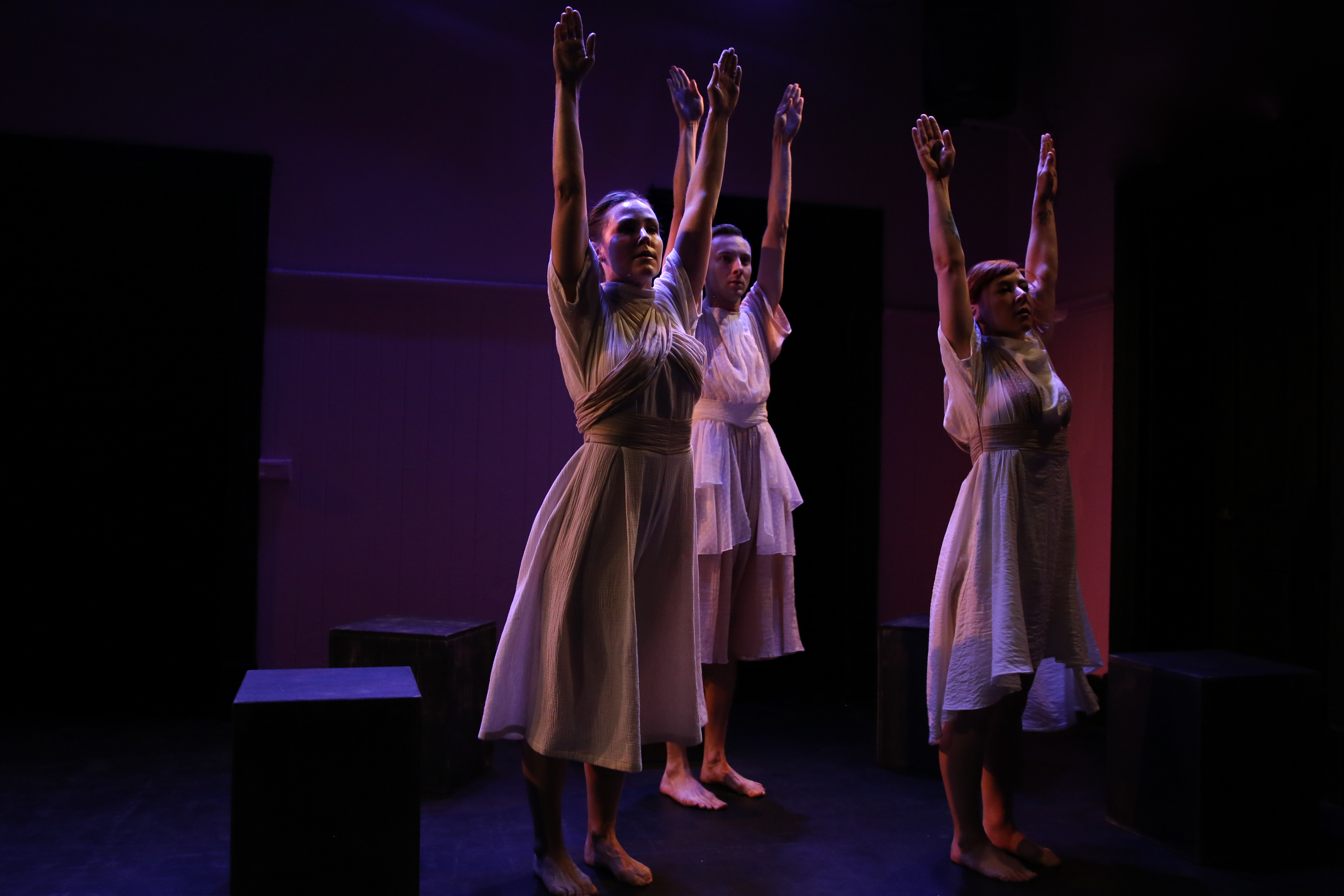 The first piece, Love you, Stranger is choreographed by Shona Erskine along with dancers Scott Elstermann, Storm Helmore, and Bernadette Lewis, with text by Vahri McKenzie, read by Jo Morris as part of the complex and haunting soundtrack by Joe Paradise Lui. Erskine explores the idea of public shaming by interpreting the true histories of three women accused of murder. The program notes emphasise a contemporary lens when viewing these three historical accounts, linking the way people are subjected to intense public scrutiny online to how these women were treated by the public after being accused of murder.