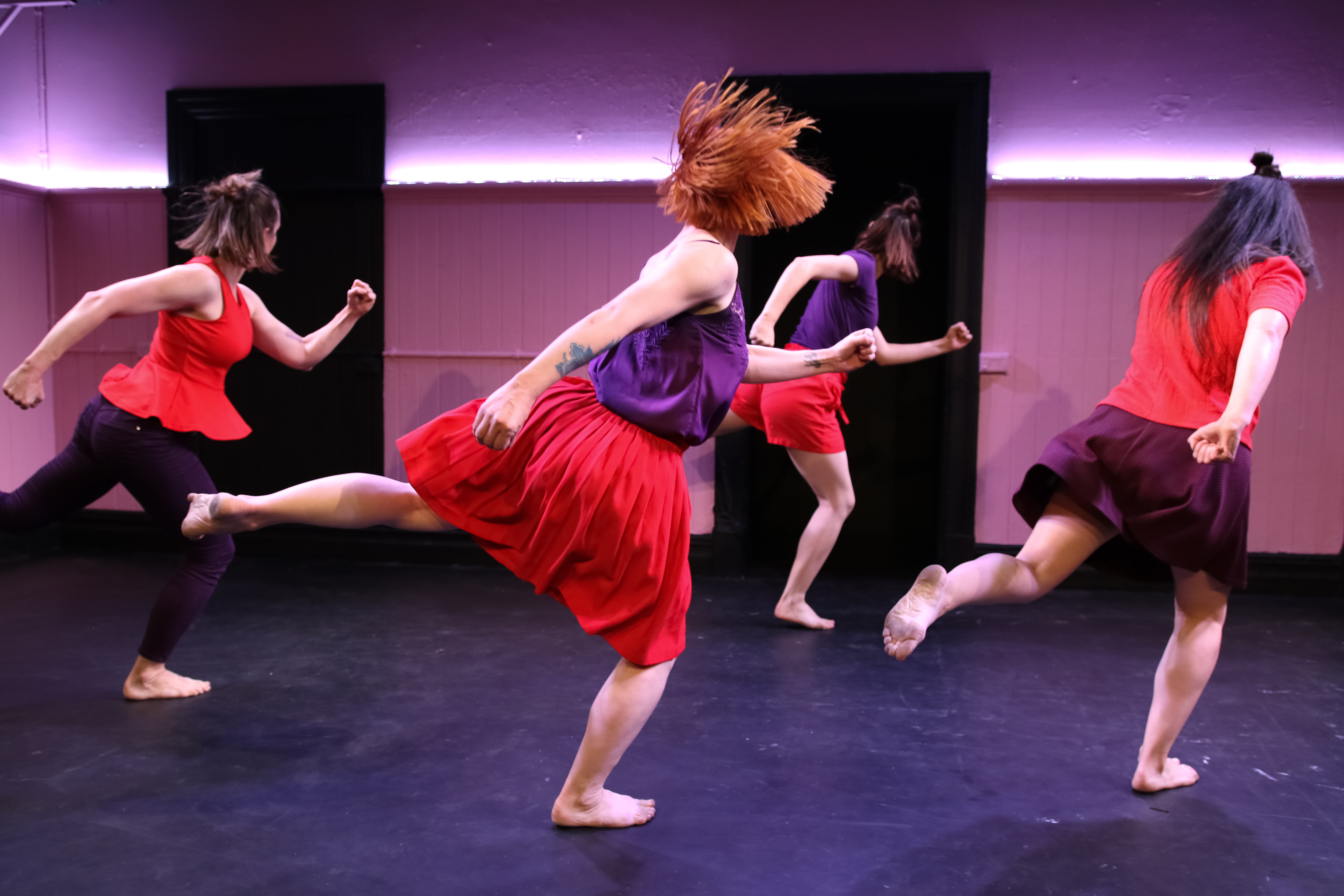 Up next is Act 2, Scenes 1-4 by Scott Elstermann, a colourful, comical, and very clever tribute to Wes Anderson’s The Grand Budapest Hotel. I was at one time an avid follower of Anderson, so I was really looking forward to this piece. I’m so glad to say Elstermann did not disappoint! He’s created an homage to the work of a man whose films are homages to a slew of cinema classics and their tropes. It’s quite a wonderful experience to recognise the camera and editing work that Elstermann is referencing in his choreography, and to see it done in the medium of dance. Stop-motion gets a big chunk of attention, and every tiny movement by each of the performers (Laura Boynes, Storm Helmore, Lilly King, and Bernadette Lewis) is picture perfect. They sometimes lip sync to excerpts of dialogue from the film, which Richie Flanagan, St John Cowcher, Libby Klysz and Bernadette Lewis have re-recorded for the piece. One of my favourite moments was a solo by Lilly King where she becomes a kind of jangly zombie. I can’t remember what that might have to do with the film (don’t remember any monster movie scenes, to be honest), but it sure was fun to watch King perform! One of my other favourite things about this piece was the absolutely gorgeous lights by Chris Donnelly, who turned three bare walls into a rainbow of Andersonian palettes. But perhaps the most fun aspect of Elstermann’s work is how each of the performers gets to really ham it up and display their comedy chops – no serious faces allowed.