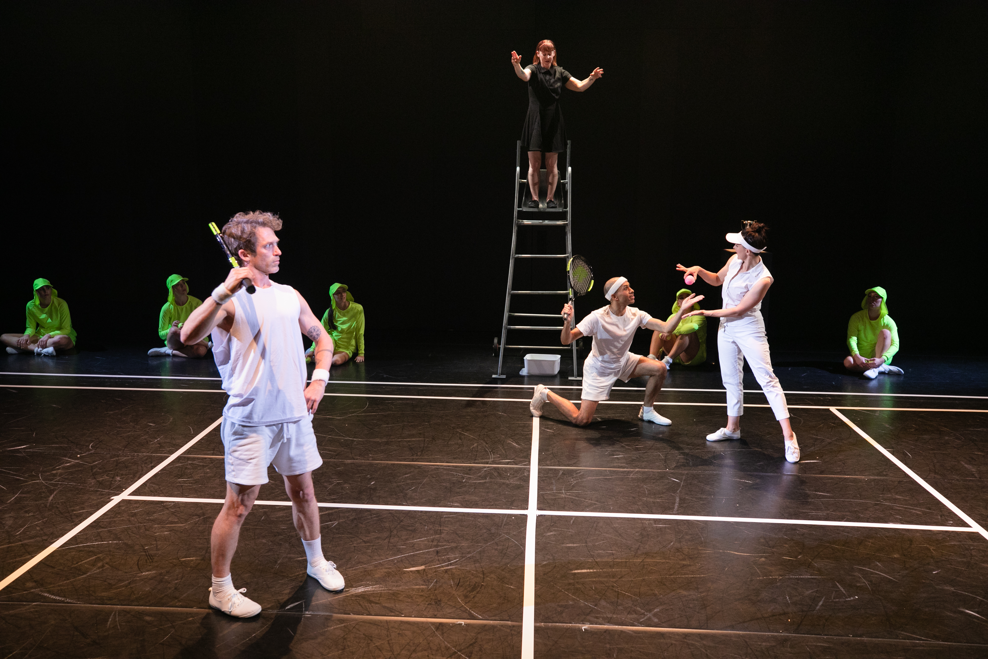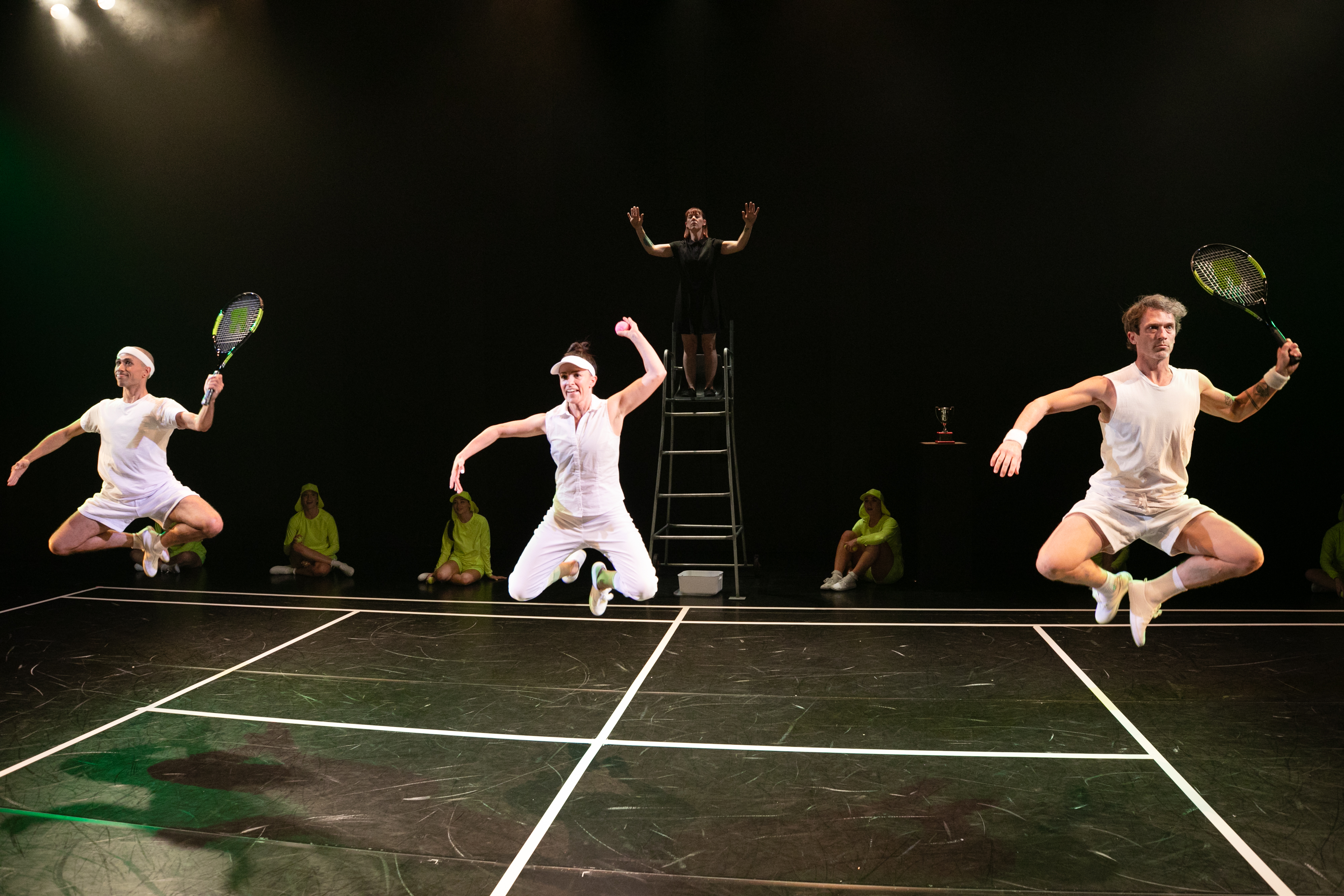 The Ballkids, a corps of six LINK dancers (Emily Coles, Briannah Davis, Jo Omodei, Bianca Perrone, Giorgia Schijf, and Emily Tuckwell), whose bouncy, fluorescent uniformity sets the tone, mostly bookend the story. They fall in line with optimism and pride, they cower and disperse in fear of the Magician, and they achieve the precision as a corps to give an impression of a synchronised swimming team or perhaps even the Harlem Globetrotters when tennis balls become part of the choreography. And in every group, ‘there’s always one’ – here, the last ballkid in the line rounds each corner with an expression of goofy, open-mouthed bliss that makes the audience chuckle.