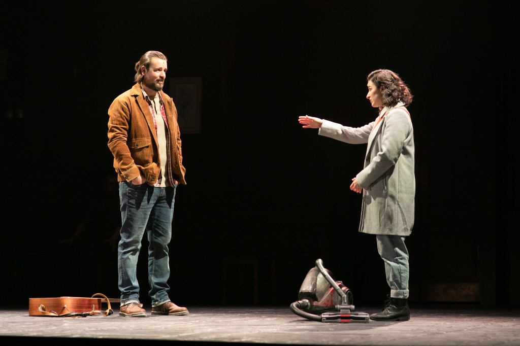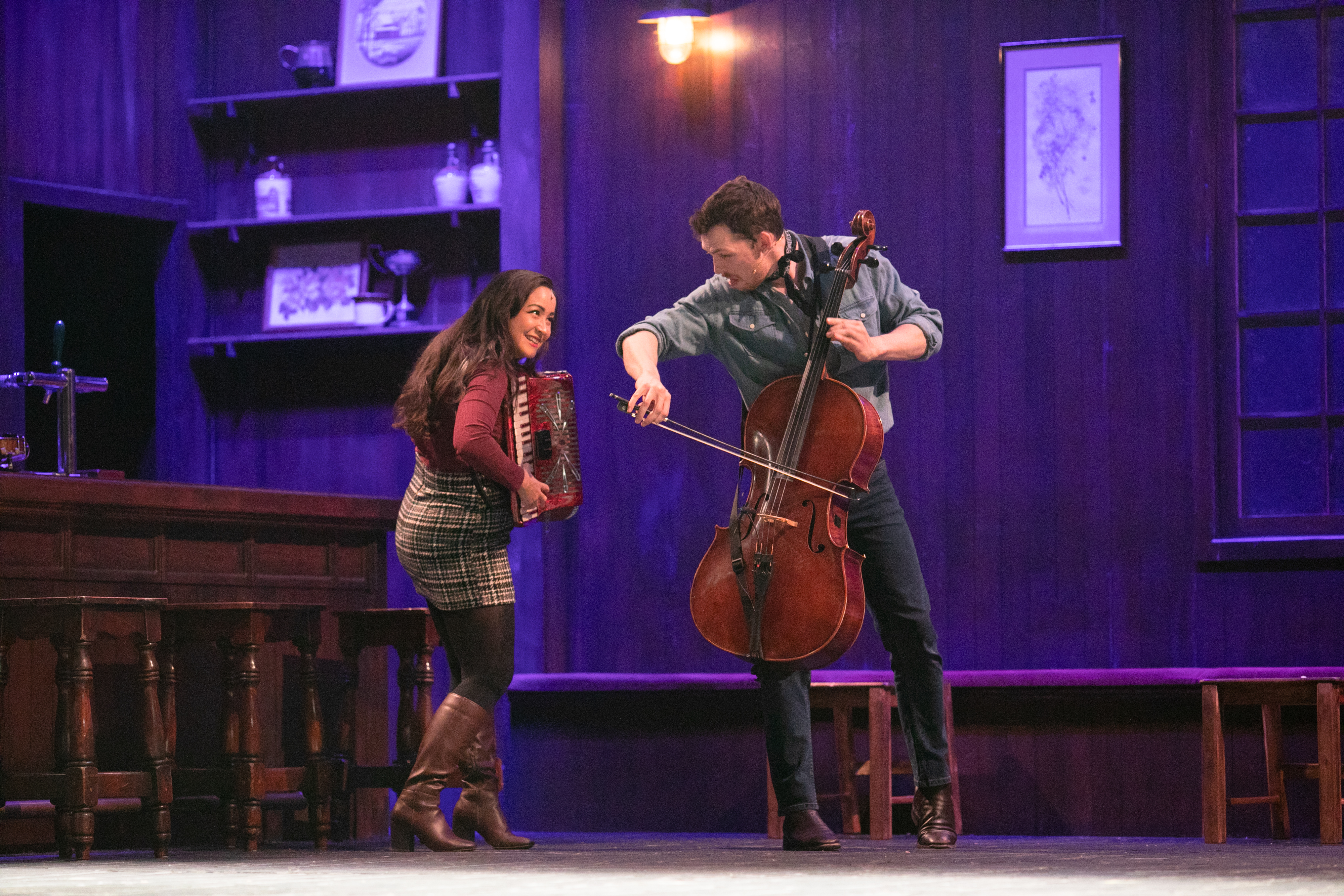 At the heart of Once is a romance with a difference; yes, there’s a meet-cute with a Guy (Toby Francis) and a Girl (Stefanie Caccamo) over a hoover, but it doesn’t go the way most boy-meets-girl storylines go. The romance that blooms between them goes beyond the will-they-won’t-they tropes and instead grows out of and for the music they create together. Guy is a brokenhearted Irish songwriter down on his luck, and Girl is a strong-willed (and serious) young Czech mother who sees Guy’s potential and pushes him to commit to his talents. While this sounds similar to countless other romances throughout film and theatre history, Once detours away from the road most travelled by giving the narrative The Commitments treatment. The Guy and the Girl get a loan from a sympathetic banker to purchase studio time and then cobble together a band to record an album, all within something like 5 days. This musical does require a considerable commitment to suspension of disbelief from the audience, but luckily our production makes it mostly painless through clever staging that sweeps us from song to song on a tide of movement and instrumentation.