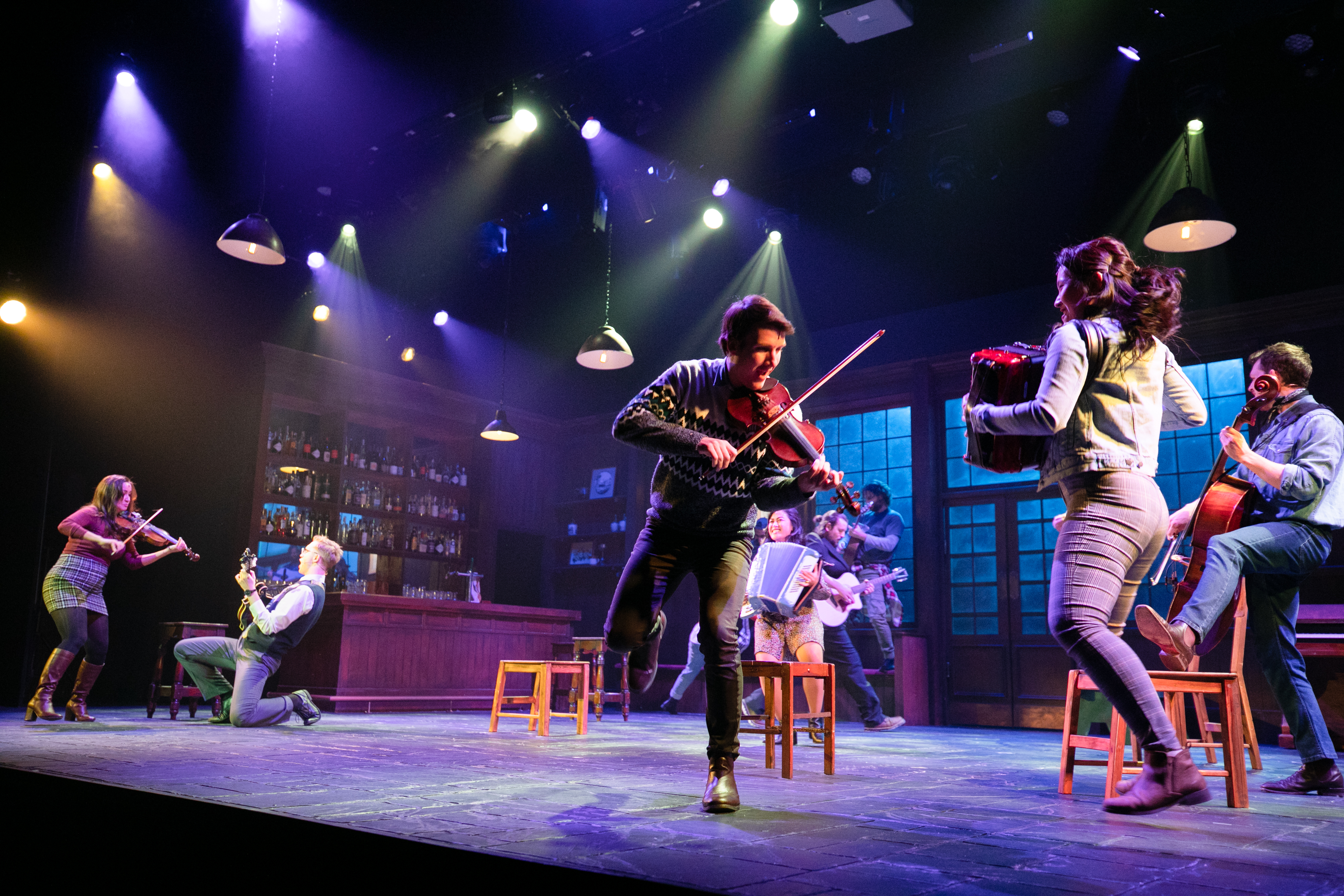 Set & costume designer Hugh O’Connor creates Irish pub on a scale befitting The Regal while lighting designer Peter Rubie maintains intimacy through creating focused spaces and painting players in as they join numbers. Sound design can make or break musical, and Once’s technical team got the balance just right.