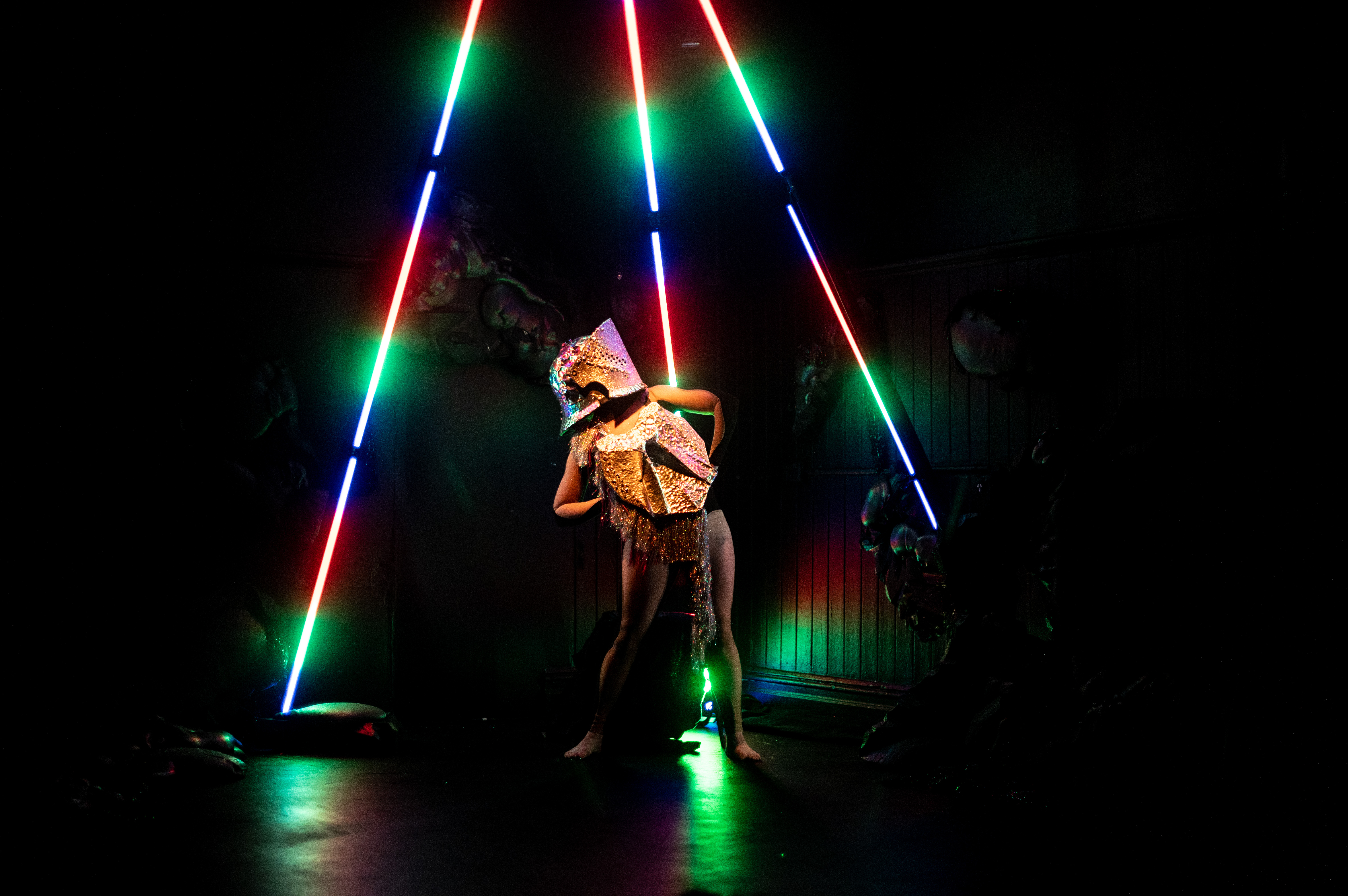 It must be said that although there is a single performer on stage (Bobby Russell), this is undeniably an ensemble piece comprised of everyone on the creative team. No single design or performance element takes a backseat, and each designer, Opie Robinson (costume and sculpture), Joe Lui (lighting), and Peter McAvan (sound), communicates their ideas with a strong, bold voice, forming a multisensory tapestry.
