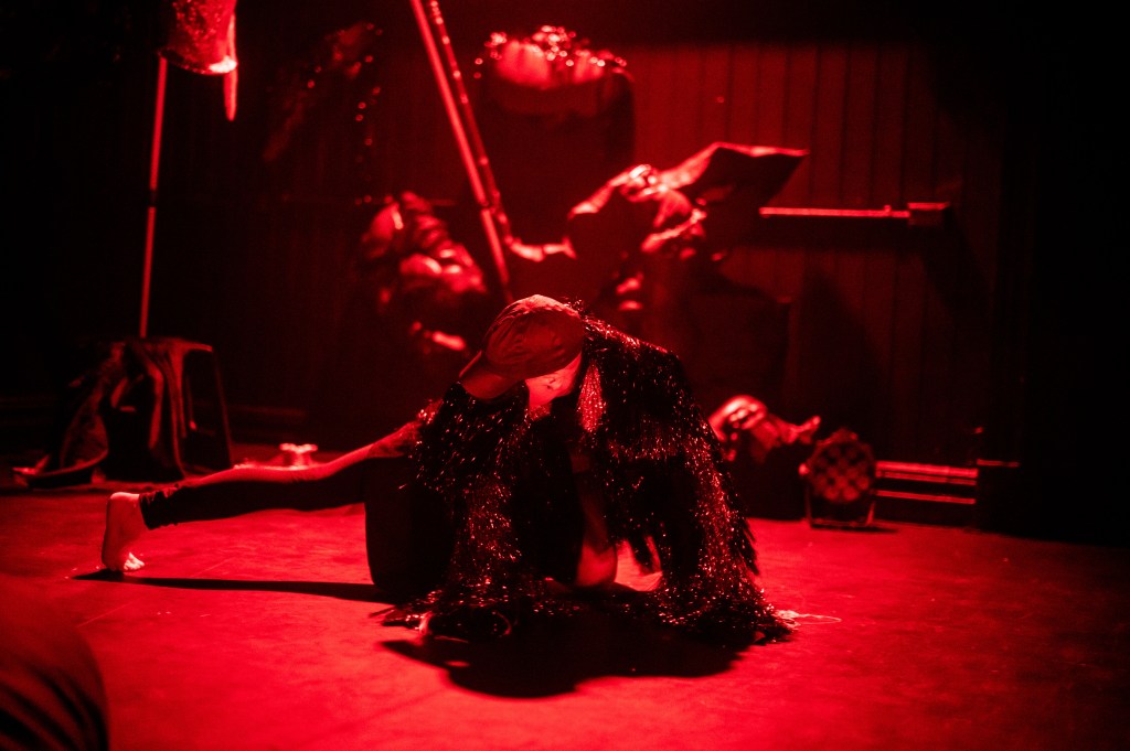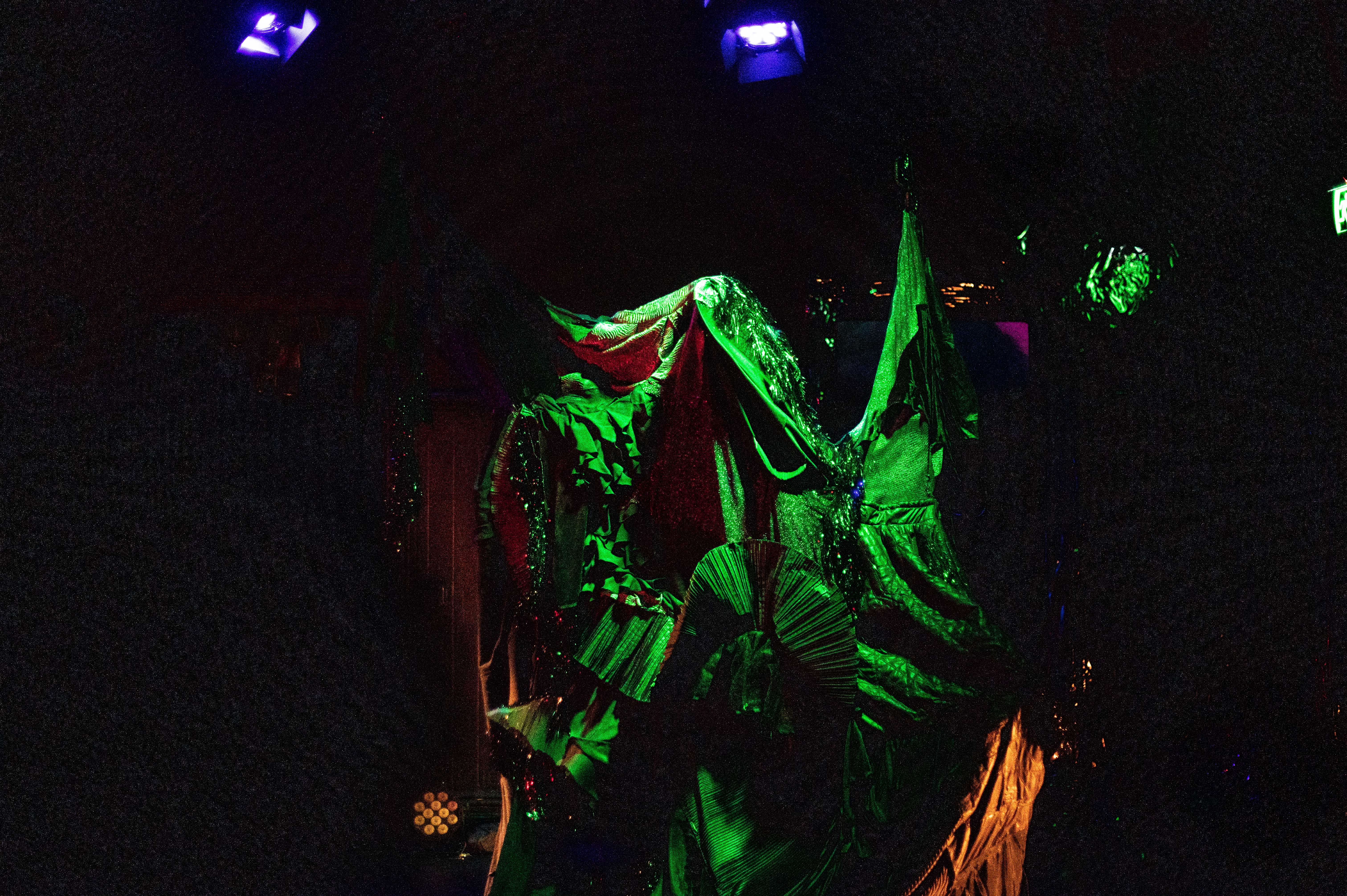The stalagmite cloth pile becomes an amorphous, monstrous nightmare coat that swallows Russell and looms unnaturally large in the first section of the piece. The second section of the piece sees Russell battling with shining armour; as they suit up in the breastplate and helmet, it commandeers their movement, which becomes more robotic and rigid. They sit beneath a tripod of multicoloured fluorescent tubes that pulsate with the music. The third and fourth movements of the piece (which I will leave out so that readers can experience these for themselves when they book tickets) move towards a resolution, where Russell uses elements from the previous dark parts to reform a new identity that seems to convey acceptance and integration of the darkness into a persona that expresses colour, lightness and shimmers with joy.