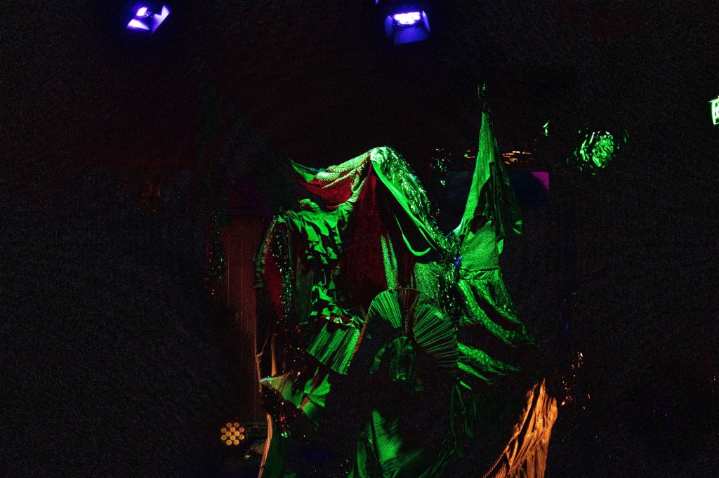 We sit, suspended in this dark space, as mist fills the stage, waiting for someone to emerge, but no one does. My eyes search the darkness for anything moving – they begin to play tricks on me and my hairs stand on end as my body remembers the haunted houses I used to go to as a kid. I’m immersed in a supernatural sci-fi/horror for a few tingly, giddy minutes, and I’m thrilled. Finally, I realise that the shape hanging from the top of the door is not Bobby Russell in vampire bat form – their faint outline at last emerges through the fog. A sudden bolt of front-facing lights blinds us, and we’re off.
