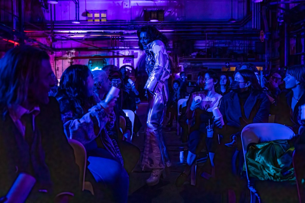 Grumble is supported throughout the night by Craig Slist, who serves as musician, backup dancer, and ritual assistant. They both wear space disco assless-chapped costumes designed by Haus of Helmutti, with Grumble’s being convertible and configurable to her needs during the show. As a production, Enemies has an effortless and seamless feel to it, a testament to the dramaturgical team and Gibson’s evolution as a performance maker.