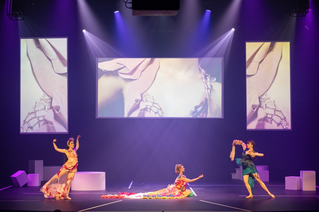 The showcase requires quite complex orchestration of each element of the production by Creative Director Helen Duncan, so that it becomes more about storytelling than parading, catwalk-style. The music and lights (designed by Rowan van Blomestein) are designed to elevate and dramatise each group of works, though the show would benefit from a sonic through-line to fill the silent gaps between sections. The dancers bring movement and energy to the stage, and for Tania Ferrier’s Angry Underwear Shark Bikini, they each wore a set of Angry Underwear for a choreographed number against a video backdrop of film footage about the outrageous garments, ostensibly from when they first made a global splash ca. 1988. This pop punk moment was a playful display of feminist art, where politics intersects with personal power and body autonomy.