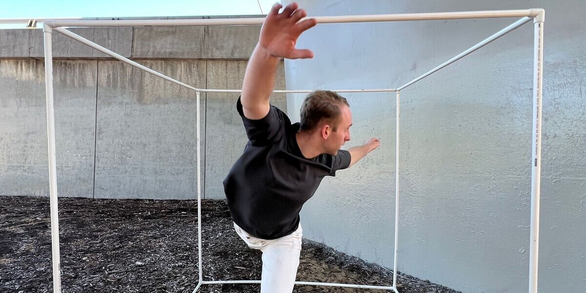 As we enter the theatre, the trio of performers are lying in a pile on the dark stage next to a large cube built from varying lengths of PVC pipe. As the lights change, they slowly awaken and are drawn towards this cube, cautiously moving their limbs and eventually whole bodies through the cube’s open frame. The first few minutes are spent with the dancers exploring the space itself and how to move in and out of it, but eventually, we begin to see that the cube is starting to have an effect on them.