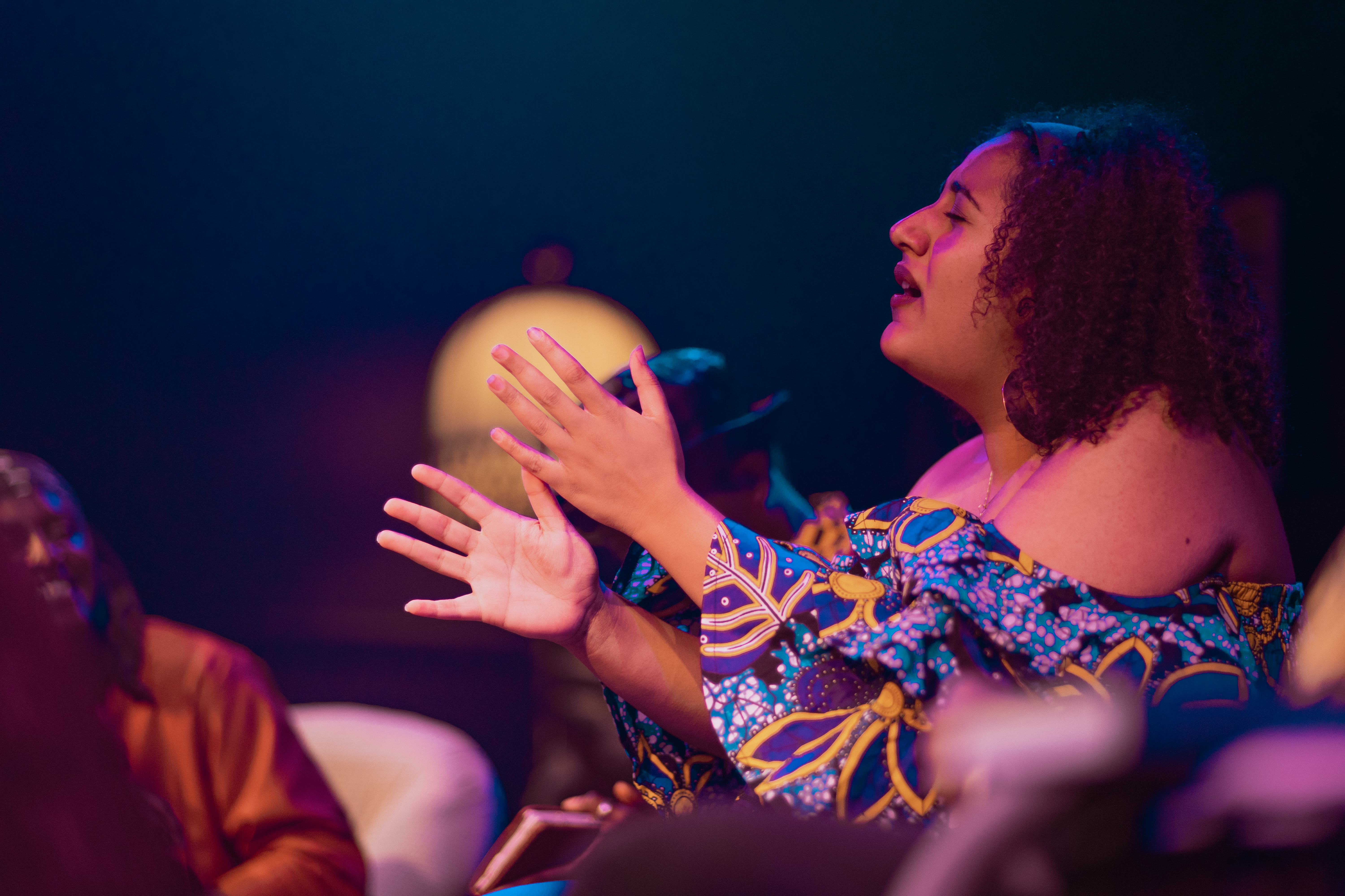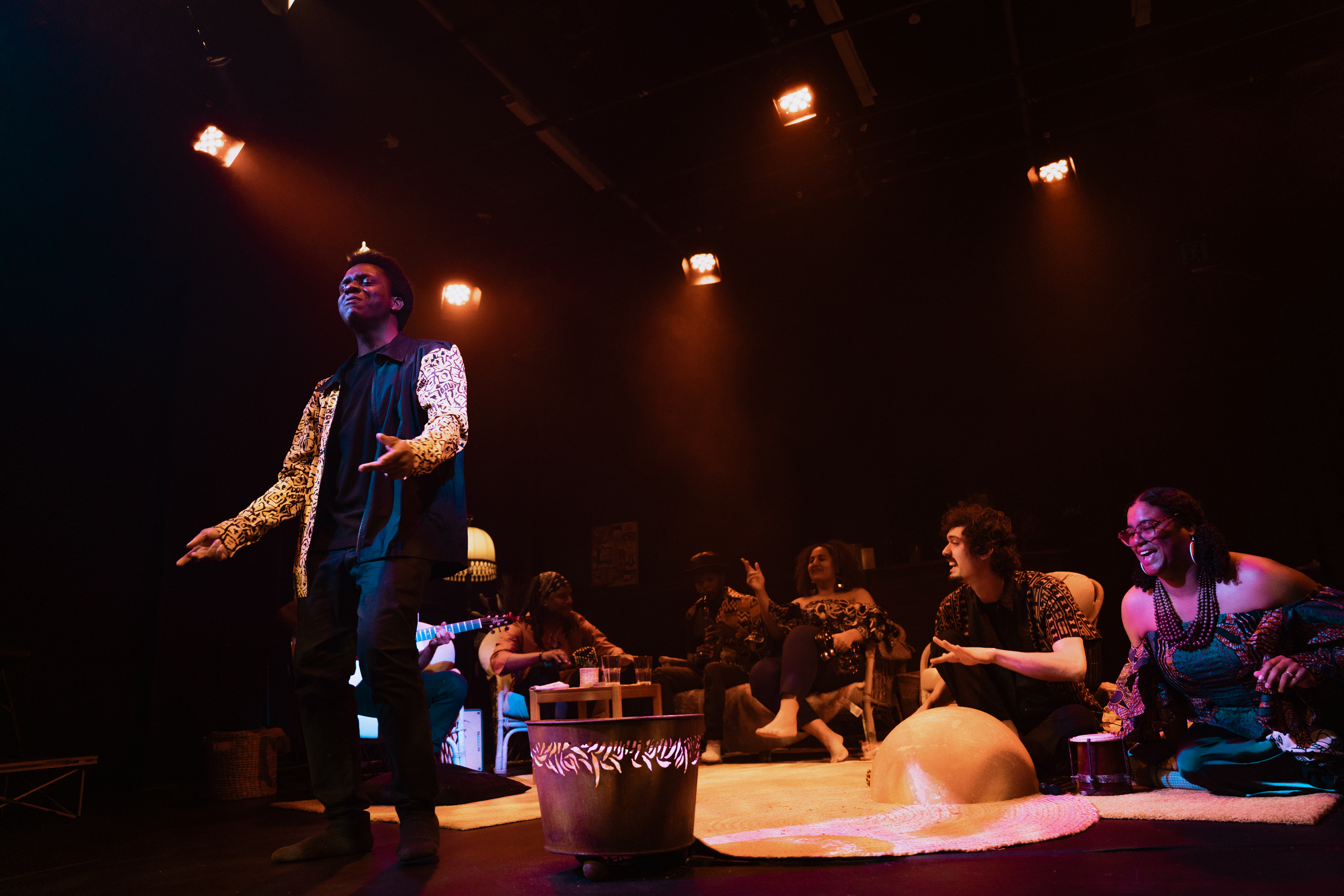 Once we pass through the double doors of the studio theatre, we find our seats in front of a cosy lounge room where a group of young folks are gathered on cushions and rattan seating under warm lights. Ndlovu sets things in motion by acknowledging the Whadjuk Noongar people, their lands, and their ancestors. He establishes this connection to land and ancestors as a major theme for the evening, one which will be visited in some way by each performer, whether through spoken word or song.