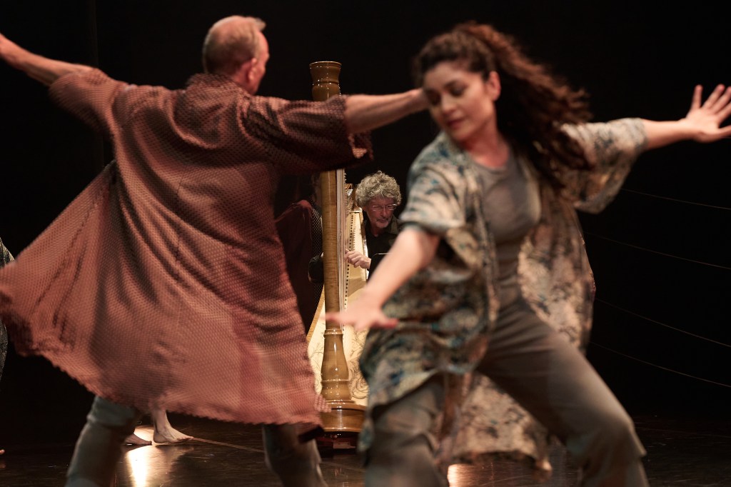 Second in the lineup was Wrinkles choreographed by Liz Cornish in collaboration with the dancers. Joining the ensemble on stage was harpist Anthony Maydwell, as well as an interesting set piece: a ‘stave’ of parallel lines of rope that traversed the stage against the rear curtain blacks. As the piece progressed, these lines sagged in the middle, alluding to the sagging lines in our skin as we age. For me, this was the most cerebral of the three pieces, but the interplay of the ‘strings’ and the bodies was intriguing and allowed for several solo moments for many of the dancers.