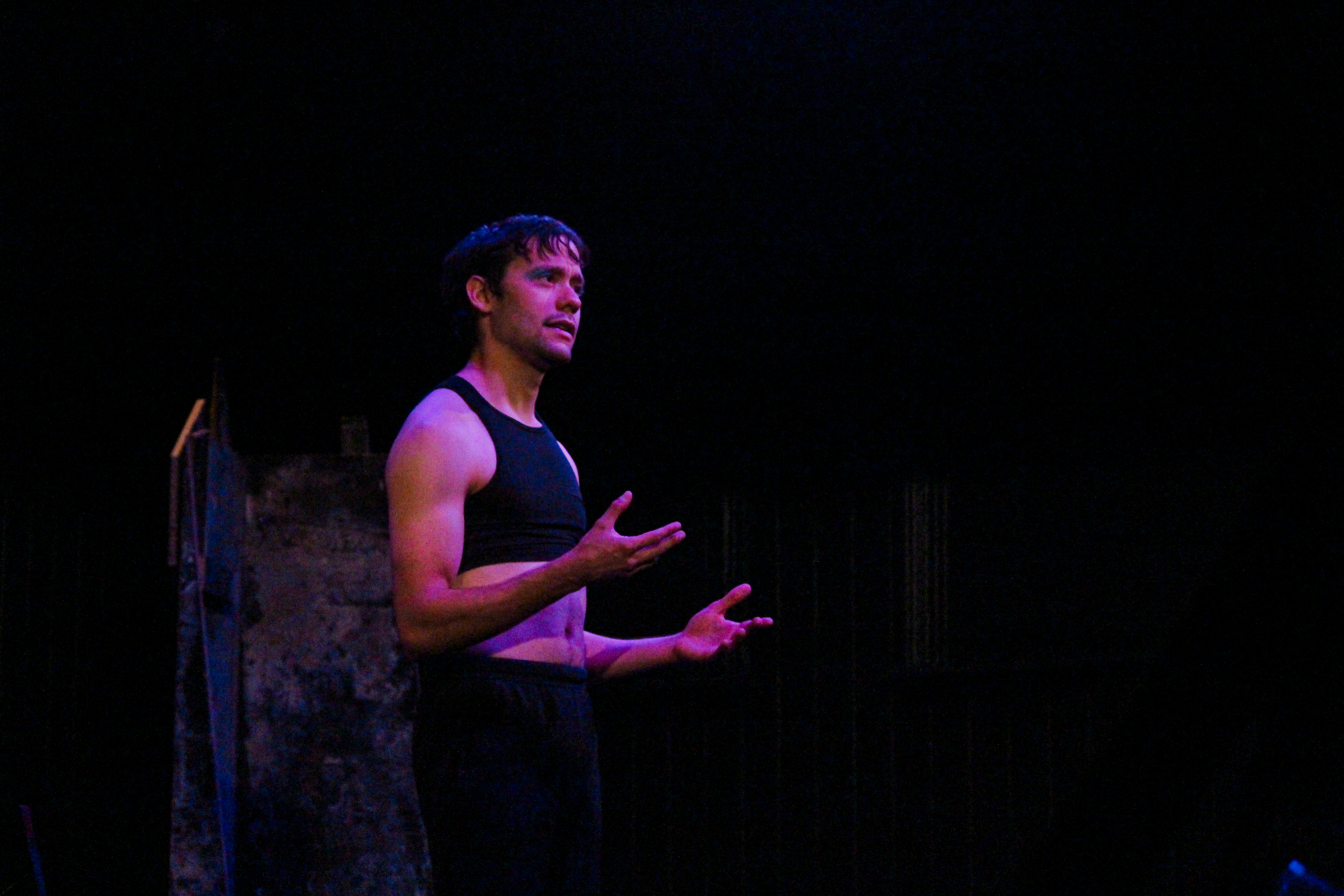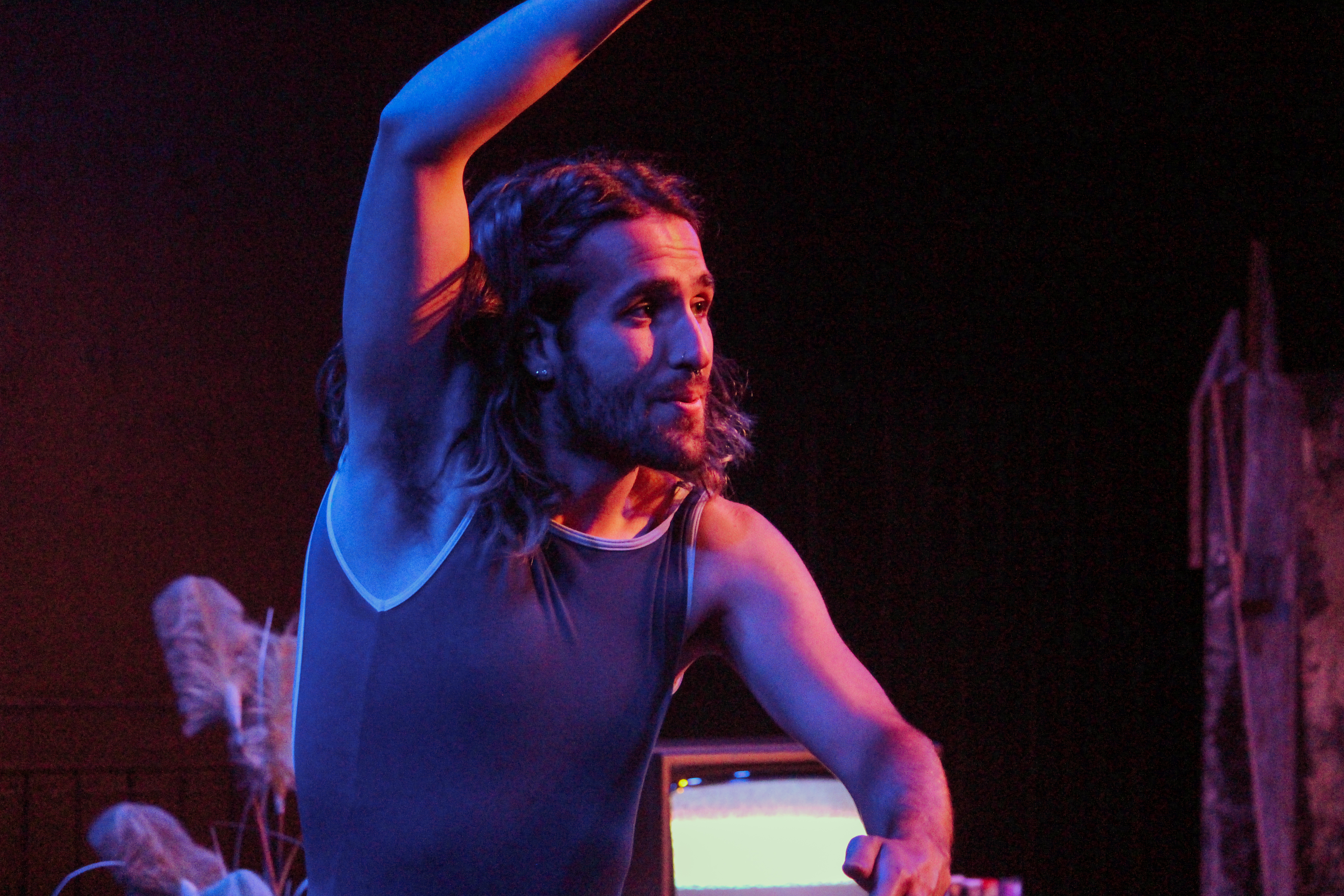 And so they did. Larcombe is a sight for this reviewer’s sore eyes; it’s been years since I’ve seen her perform, and her return to Bluey is long overdue. In Unnatural, she’s given the opportunity to show depth, wisdom, and serenity as a storyteller; she puts us at ease as we enter the show’s universe and delivers the final words with gentle mercy. There was a very late casting change that brought Jupiter to the scene; they intermittently referred to their book during the performance, but this actually worked quite well within their character’s given circumstances, and it certainly didn’t get in the way of their dynamic, physical performance. Critti-Schnaars, a gifted performer who also happens to be gifted with a stutter, captivates with his unique voice and beautiful way of speaking, giving his words and emotions a singular gravity.