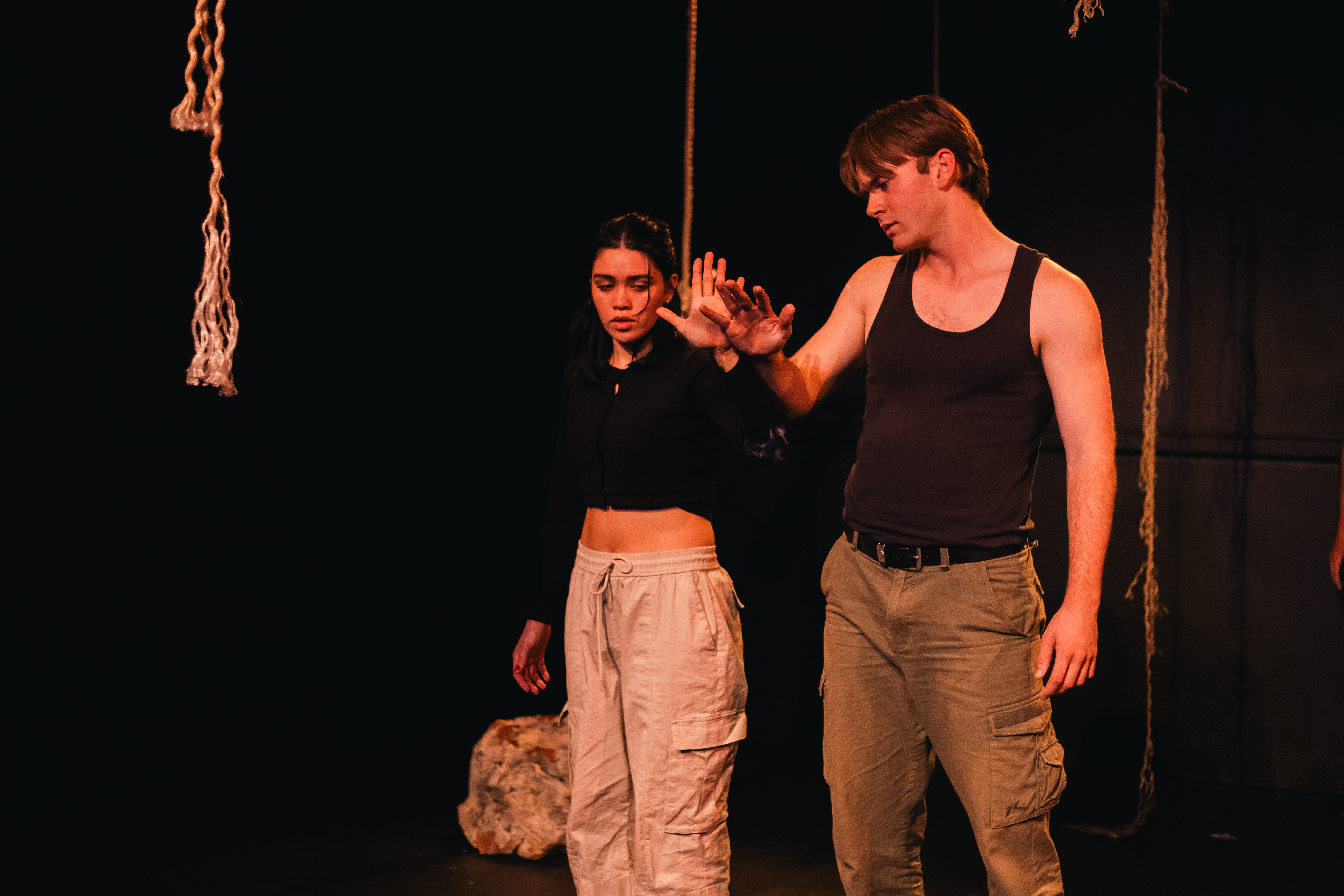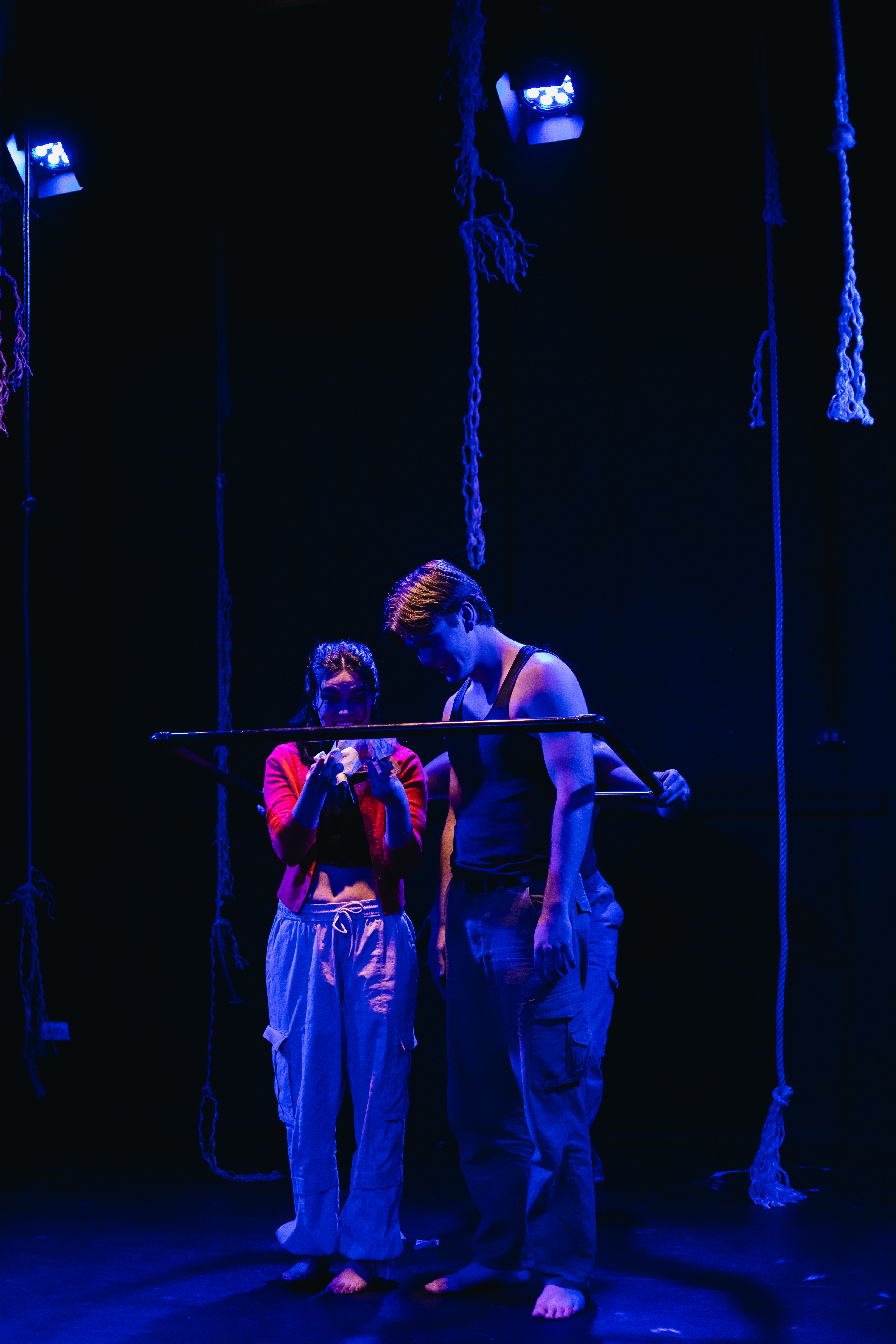 Ask has undergone periods of development since its inception in 2021 which have taken the play from a 10-minute seedling to its current stage of flowering. Its most engaging and exciting moments come when Hostalek leans heavily into physical theatre elements to highlight the symbolism within the narrative. The multifunctional use of a simple black picture frame and a blank white canvas amongst a forest of frayed ropes hanging from the ceiling (design by Megan Mak) facilitates the narrative in an outside-the-box way. The sonic world created by Levi Widnall and the audiovisuals designed by Laura Goodlet further immerse us within the story.