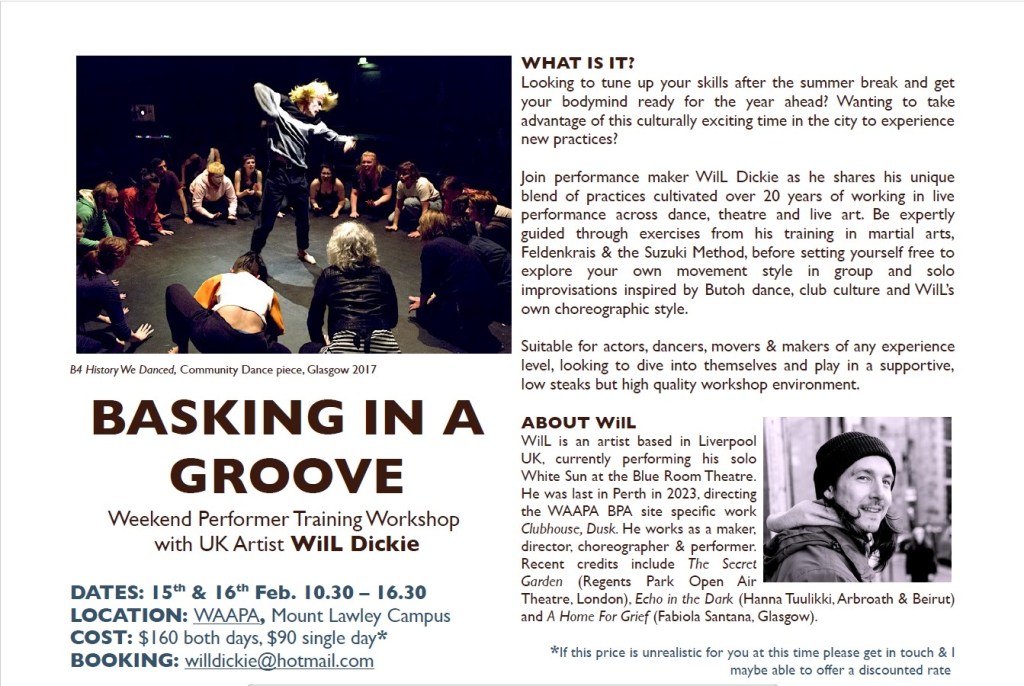 The name of the workshop is Basking in a Groove, it’s this weekend coming, 15th and 16th February at the Western Australian Academy of Performing Arts and we’re going to have six hours each day with a lunch break, so that’s a good chunk of time! We’re looking at Feldenkrais & the Suzuki Method, improvisations inspired by Butoh dance. It is for anyone. If you’re interested in developing a physical movement practice this is for you!
